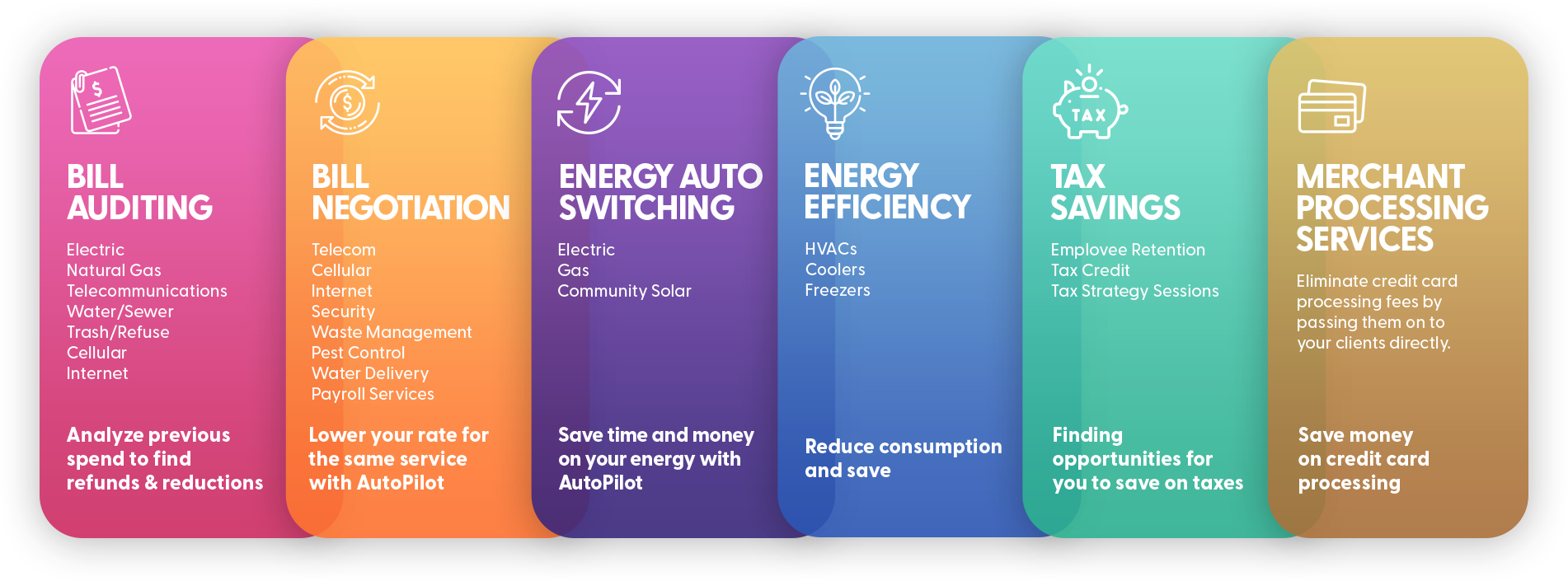 If you’re like most businesses, you could be overpaying lots of different ways. Maybe you are paying more than you should for basic services like Internet or phone. Or maybe you are not optimizing your energy consumption and rate. Or maybe your utility bills have errors, discrepancies and mistakes that you can correct and pay less. Regardless of WHY you are overpaying, the HOW to lower your bills is simple. Let us manage them for you!